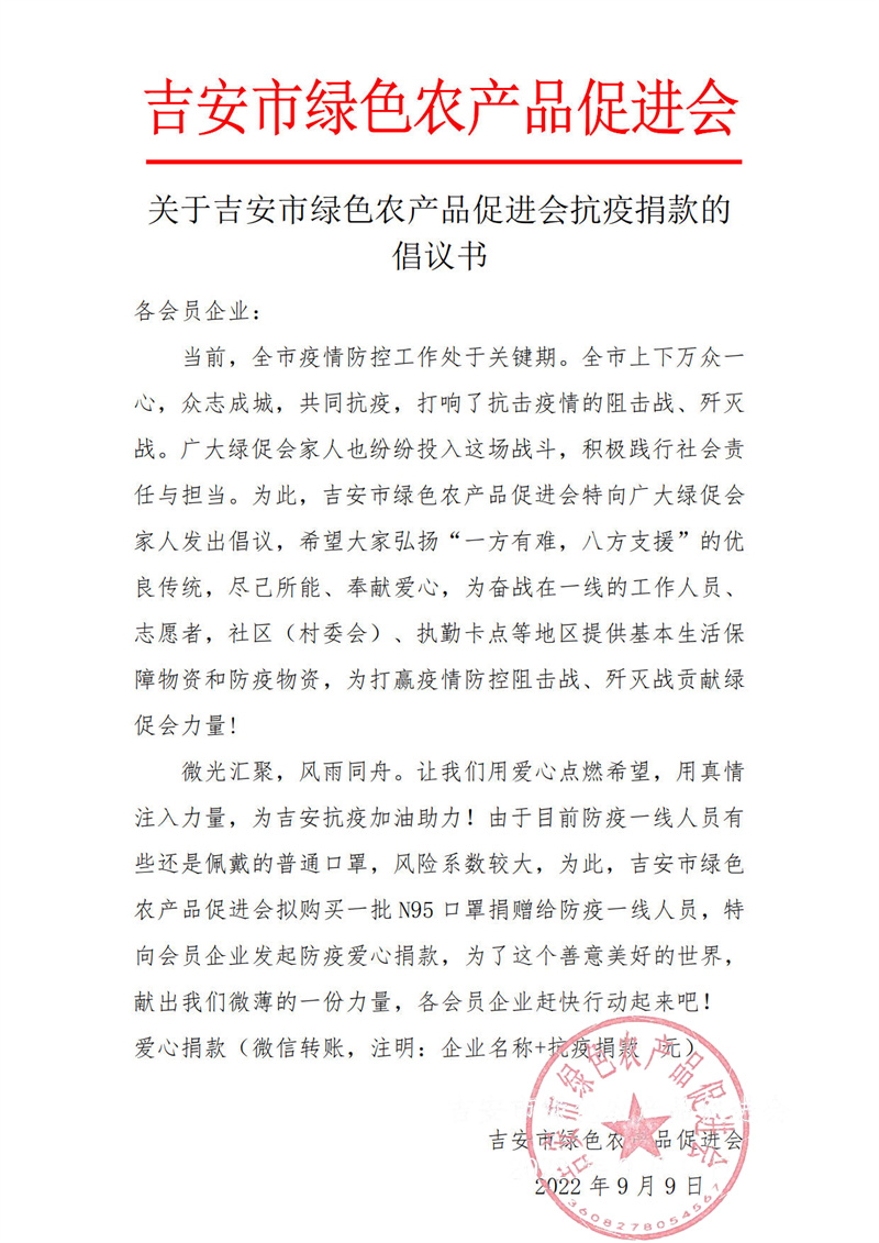 十二、吉安市绿色农产品促进会向会员企业发出抗疫捐款倡议书