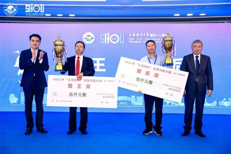 图为工作人员展示蟹王、蟹后,上海海洋大学供图